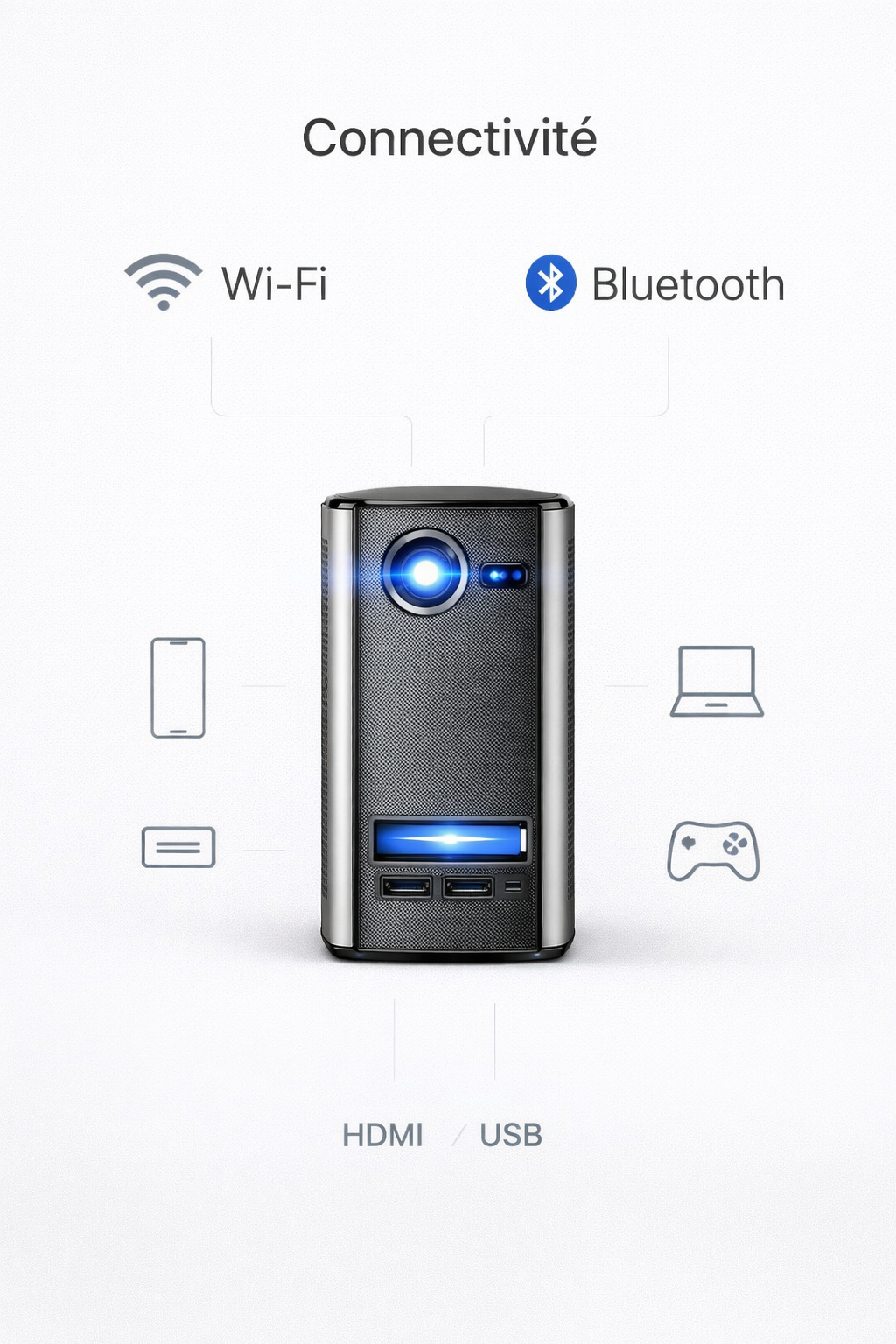 Oui, le mini rétro-projecteur ND Project est compatible avec iPhone, Android, tablettes, ordinateurs et consoles via HDMI, USB ou câble adapté.